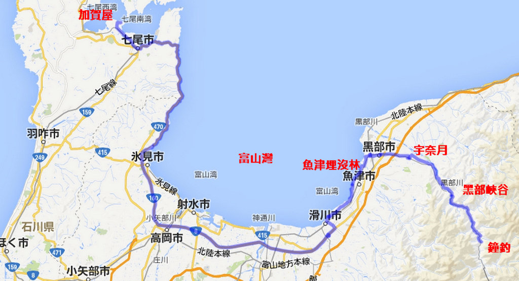 由七尾加賀屋往太平洋這邊走,沿著富山灣海岸走,走160號公路