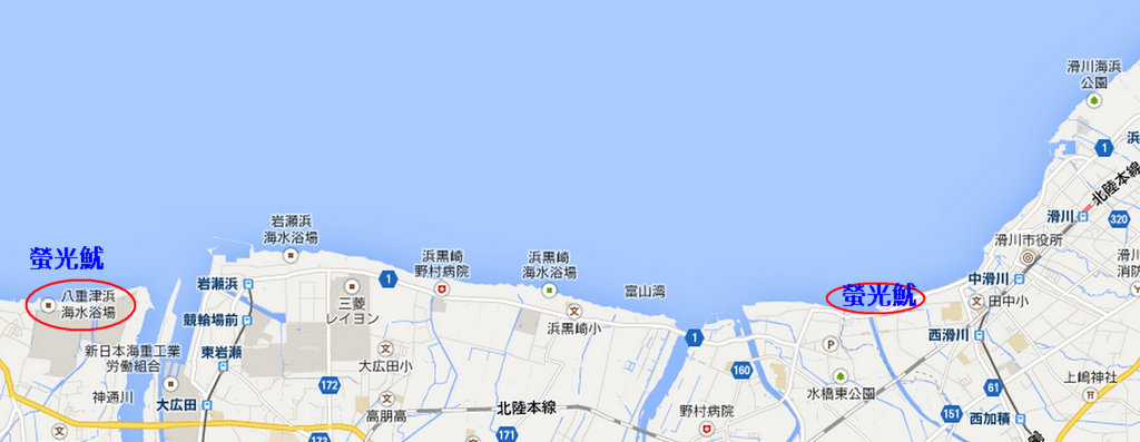 最常看到螢魷的就在富山市的八重津浜海水浴場以及滑川市(Namerikawa City)漁港附近
