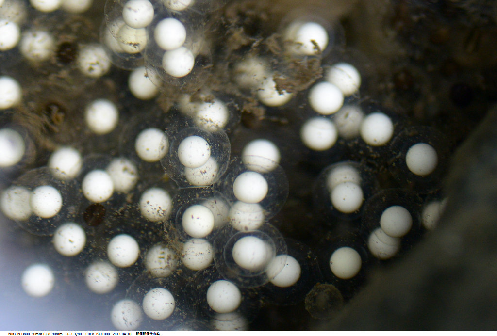 白色的卵 透明的卵膠囊 每顆都互相黏住 也看到有部分的卵已經有小蝌蚪的樣貌了