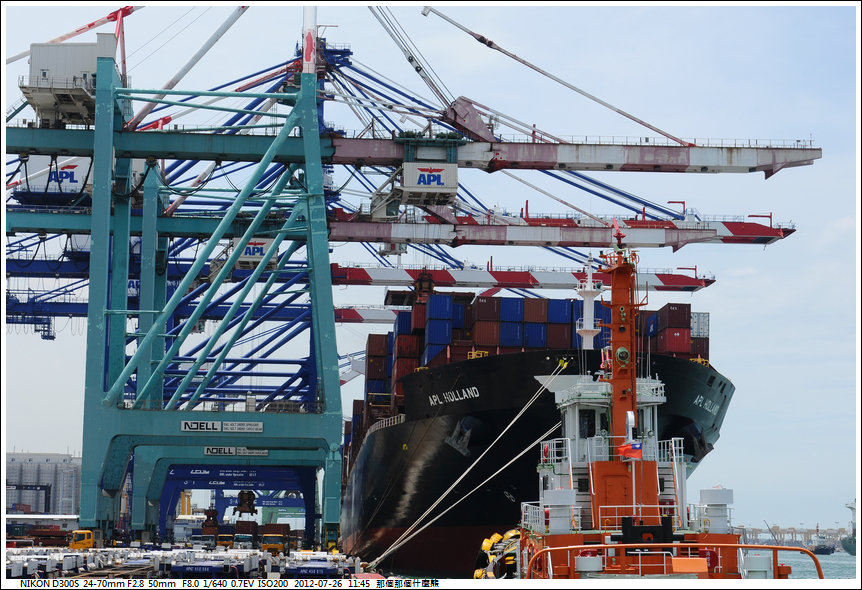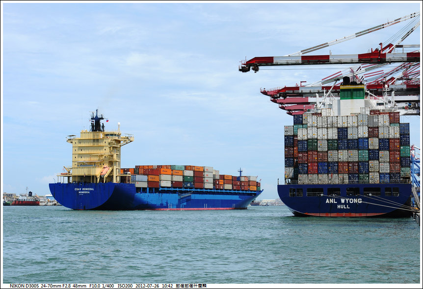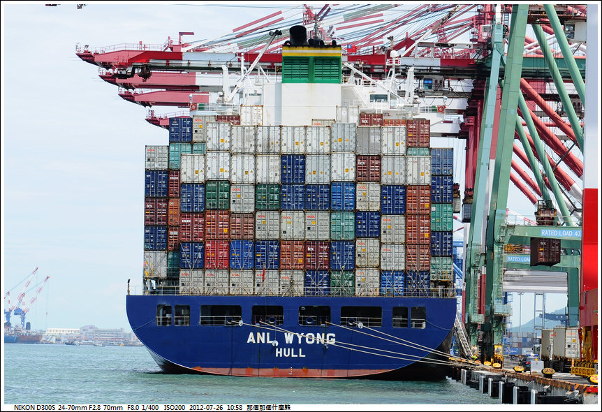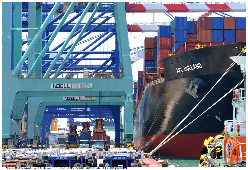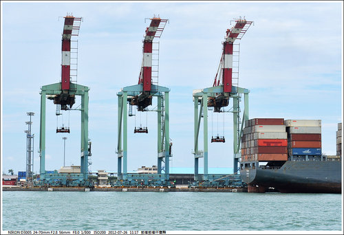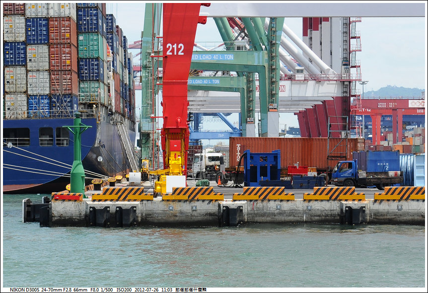 另兩部起重機 是將要出口的貨櫃由貨櫃車上吊上船