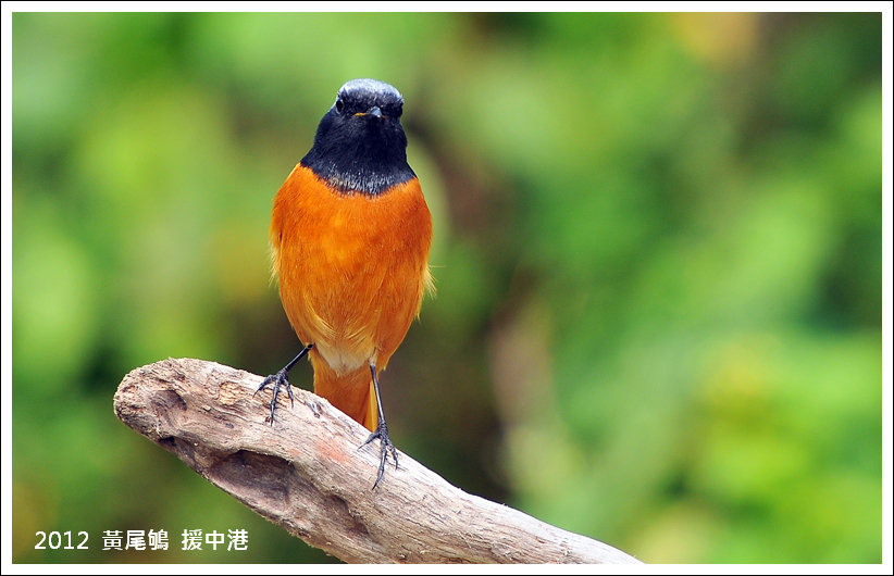 黃尾鴝雄鳥 正面看 臉部至頸子全黑 像是中古世紀劊子手戴著黑頭罩