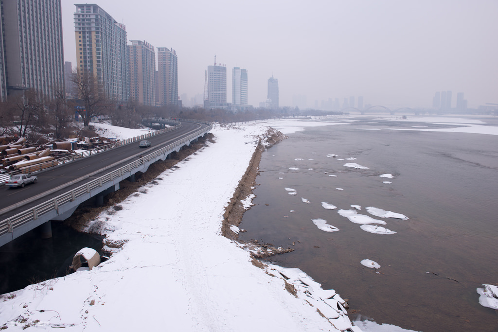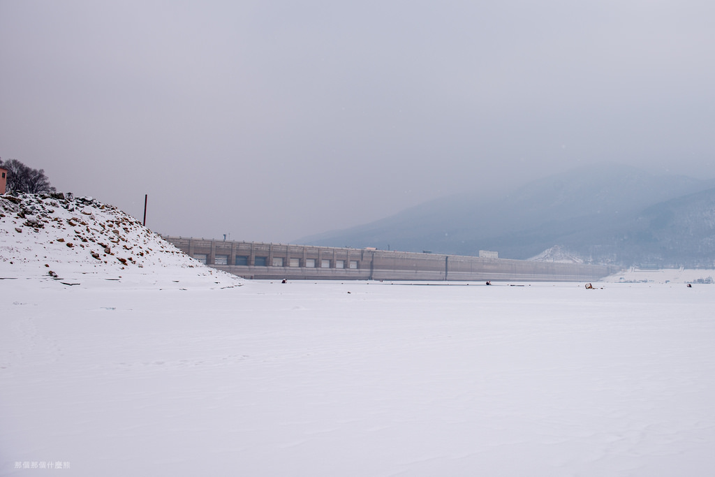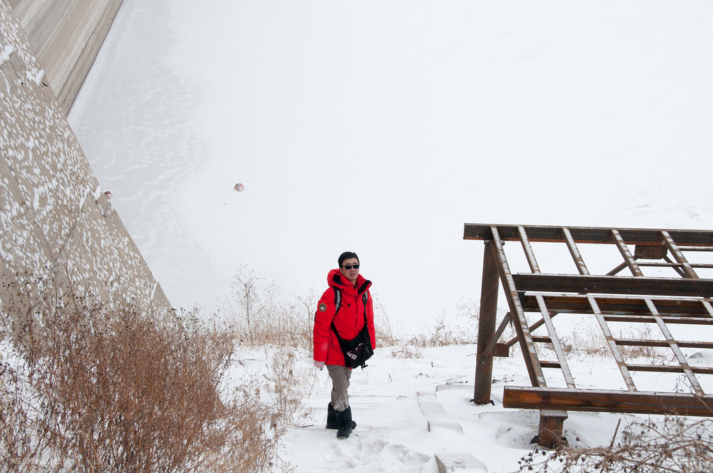 試著由大壩旁走下松花湖,但因邊坡積雪及膝,踩踏太軟而放棄
