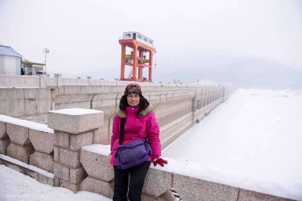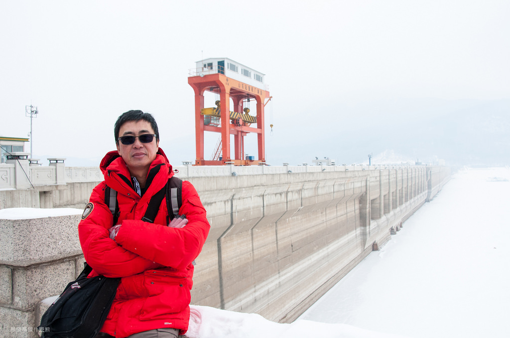 冰封的水位很高,已經到大壩的放水口了,這是踩在冰封松花湖面上按快門的