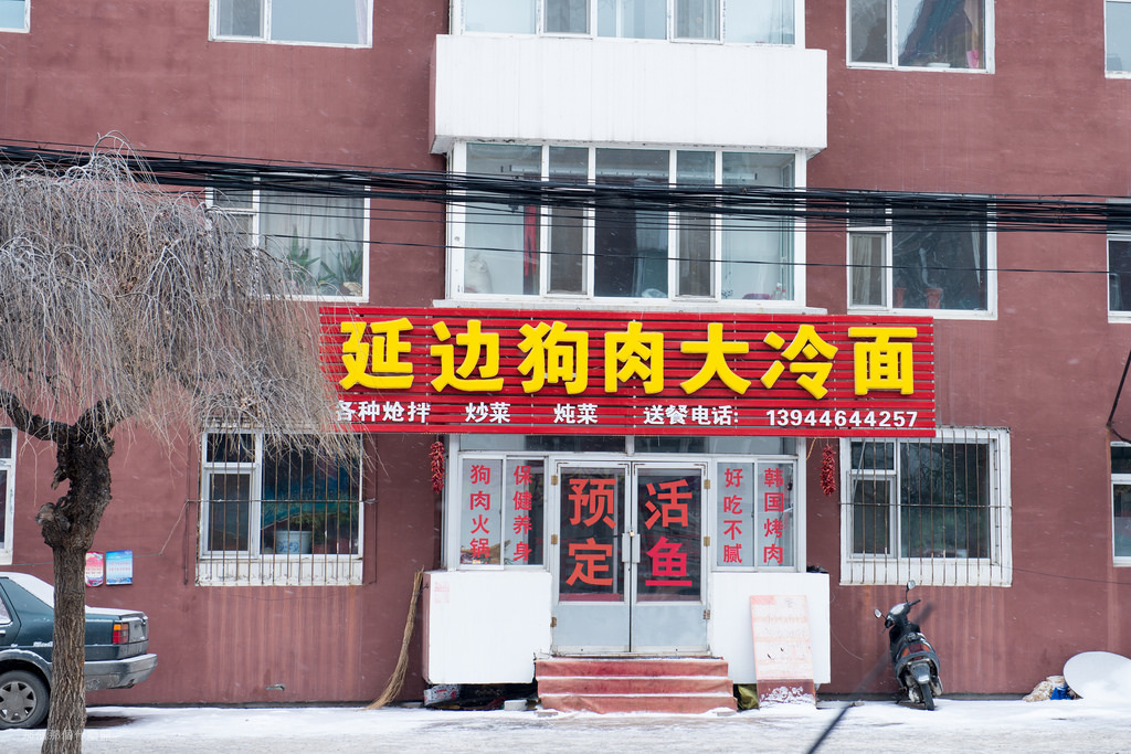 在吉林市的街道上已經看了許多次,文廟胡同裡也有好幾家在賣狗肉,甚至燒烤店的菜單裡就有狗肉及其內臟