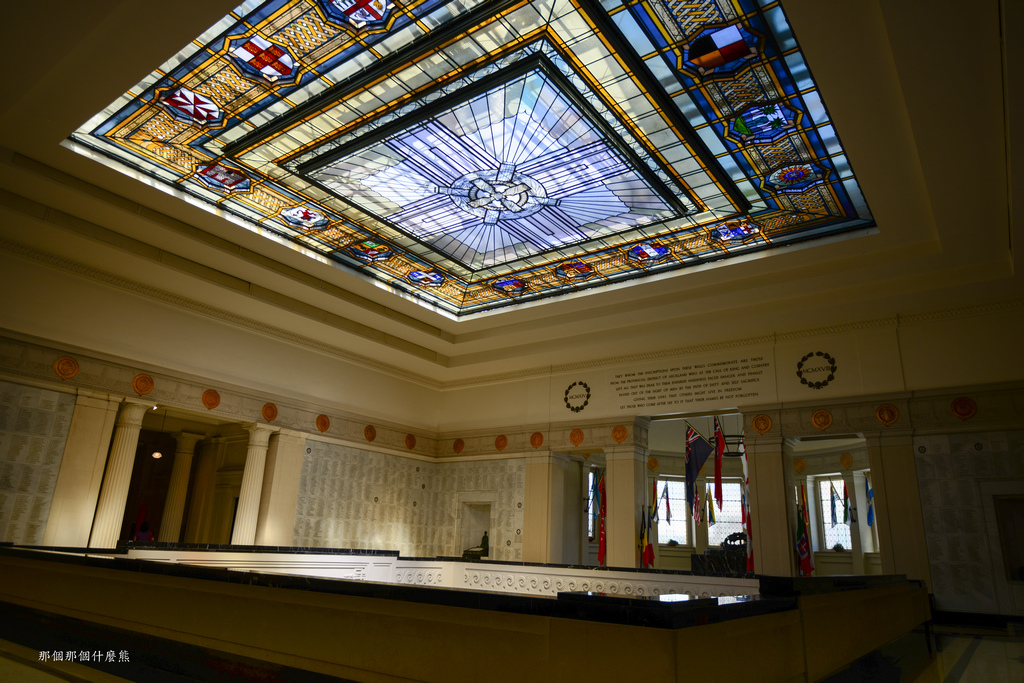 ↑彩繪玻璃天花板,顯示在第一次世界大戰期間所有被英國統治和殖民地的徽章