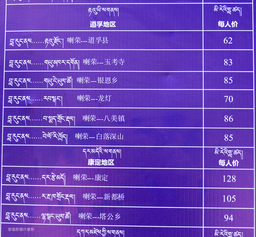 這是佛學院喇榮停車場拼車車資表,佛學院上下山的交通車巴士司機在輪班空檔時教我怎麼看
