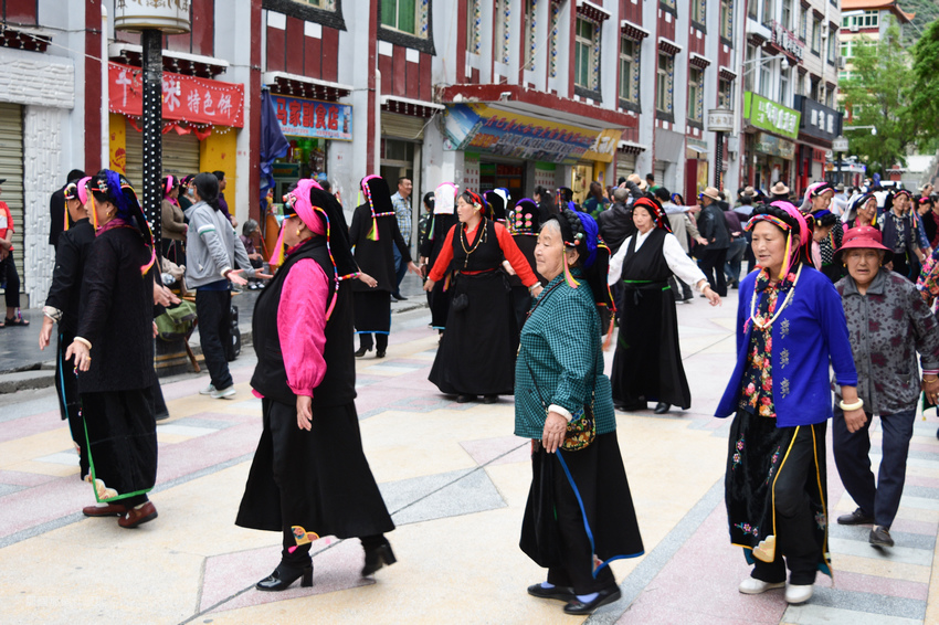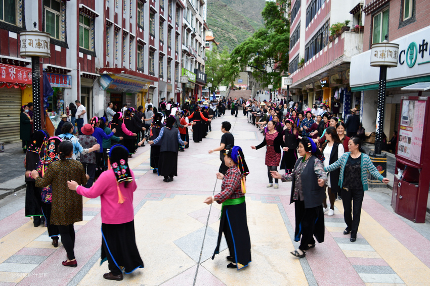 ↑民眾穿著嘉絨傳統服飾在步行街跳民族舞蹈,真是很有活力、很注重健康的民族啊!