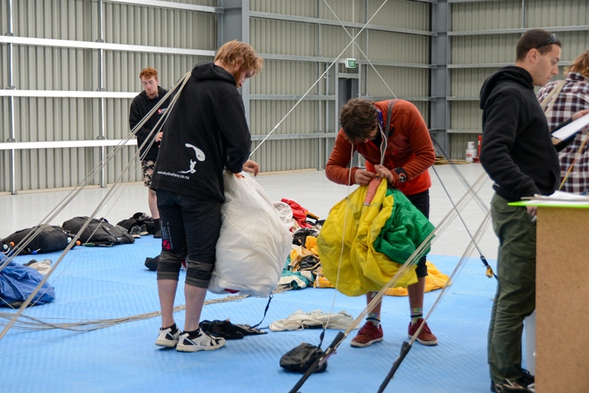 教練們正在整理剛跳回的傘具
