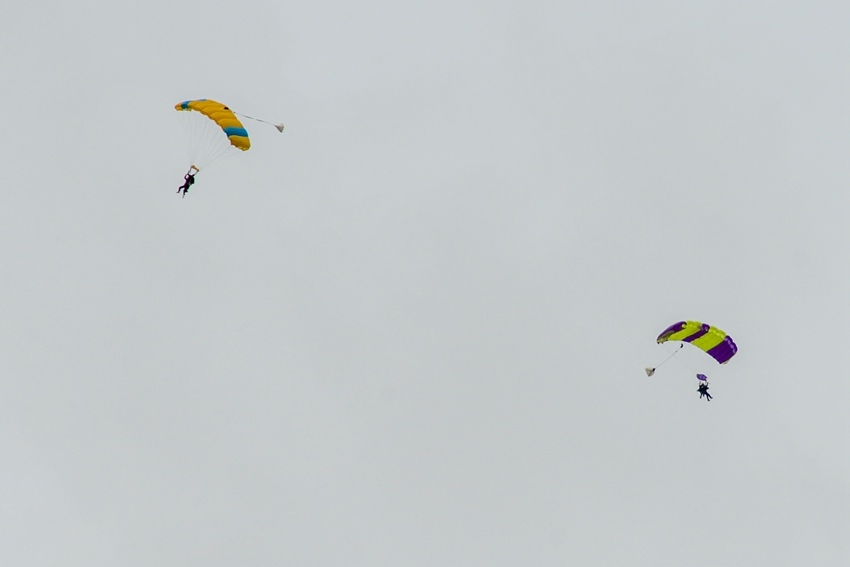 在地上的我們看到一傘又一傘往下降,突然幾張傘在空中大角度的擺盪