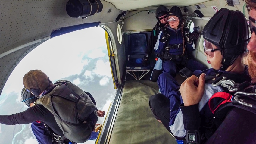 這種飛機上升的速度很快,我們這架次有四組人跳傘,學員坐在教練前方