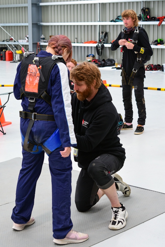 (這是Nina的教練,協助著裝,講解注意事項)