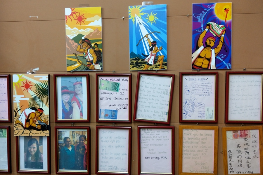 走上高眺亭的上層,一位長者將洗茶具的水直接由上層往下倒,底下的年輕女孩被潑得驚叫