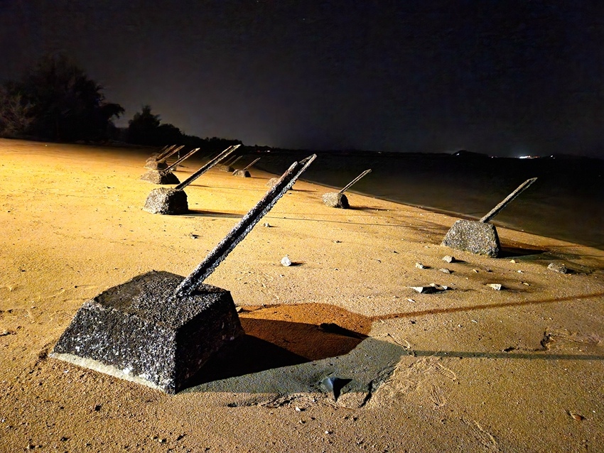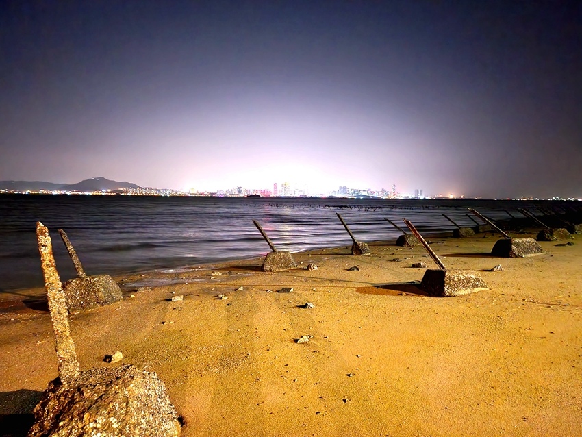 岸上有一些燈飾裝置,海灘上仍然佈滿軌條柴,畢竟廈門就在眼前