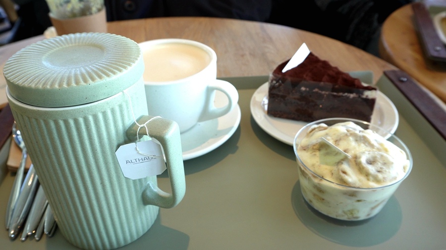點了蘋果柚子茶、奶茶、洋甘菊、香橙磅蛋糕、香蕉布丁、巧克力蛋糕、紅豆奶油司康