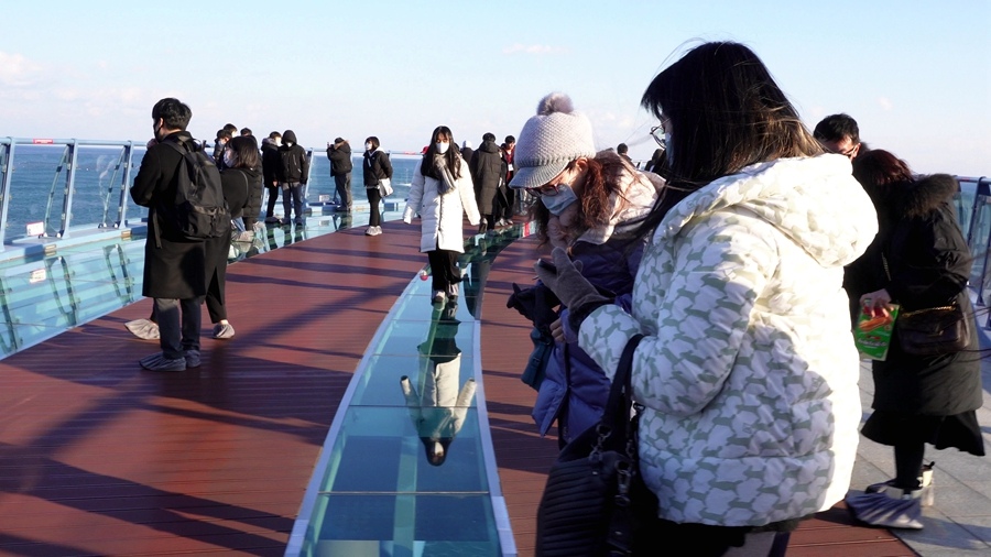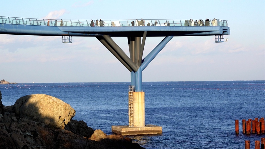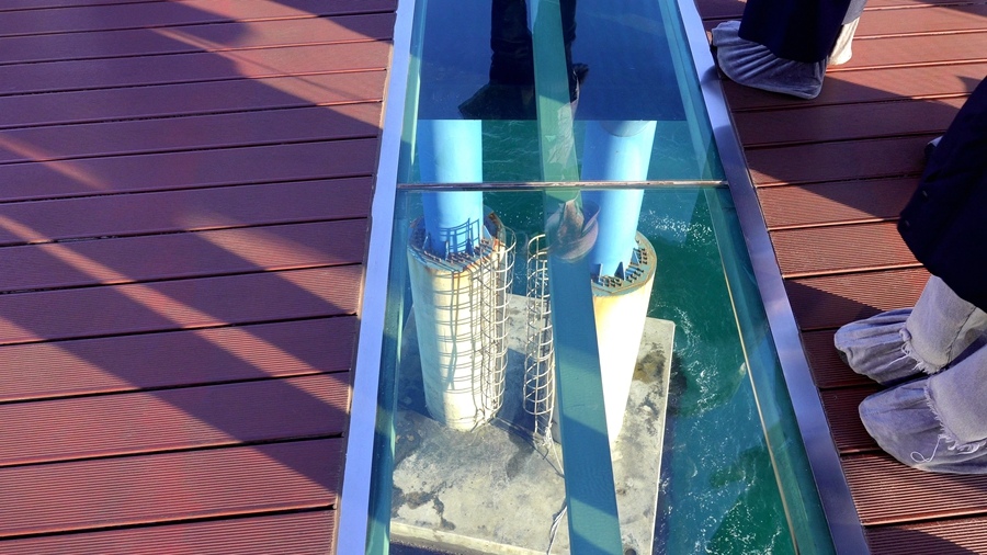 腳底下有透明玻璃,可以看到清澈的海底及橋墩(柱)