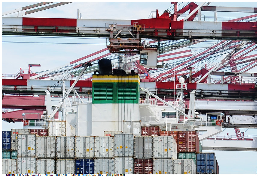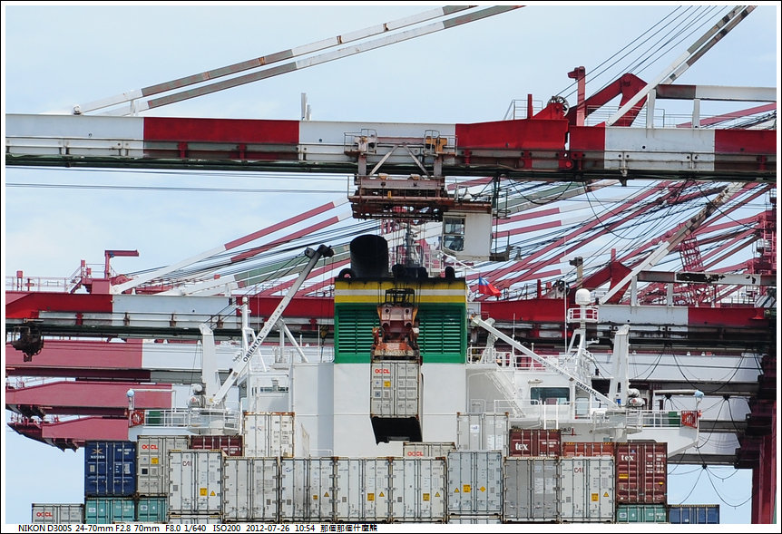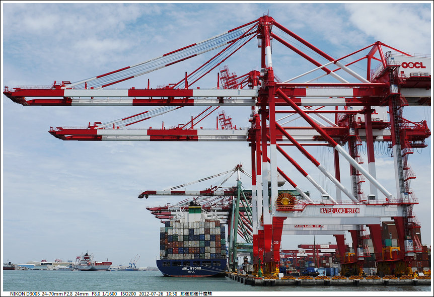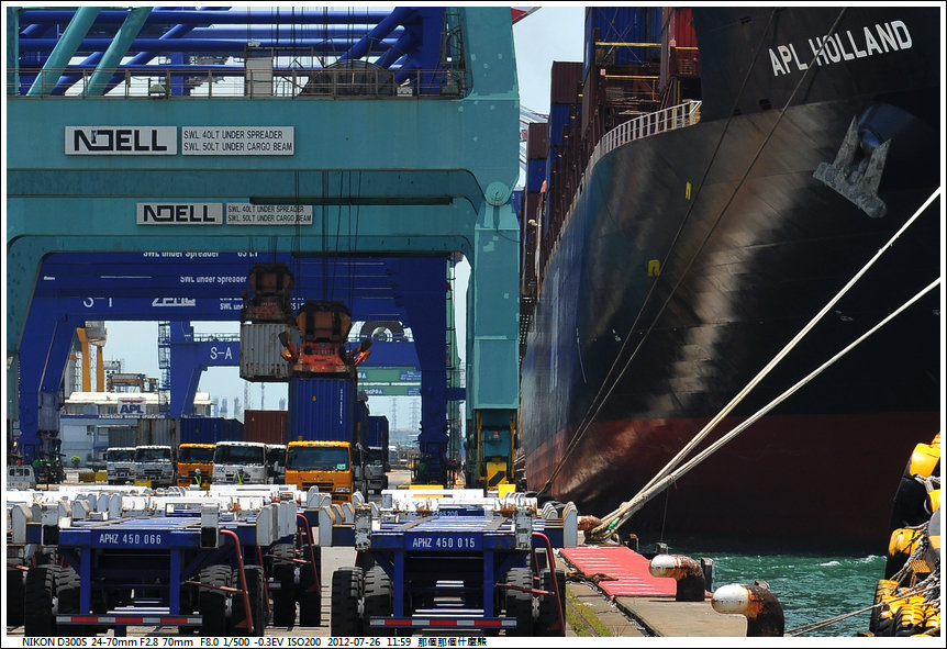 另兩部起重機 是將要出口的貨櫃由貨櫃車上吊上船